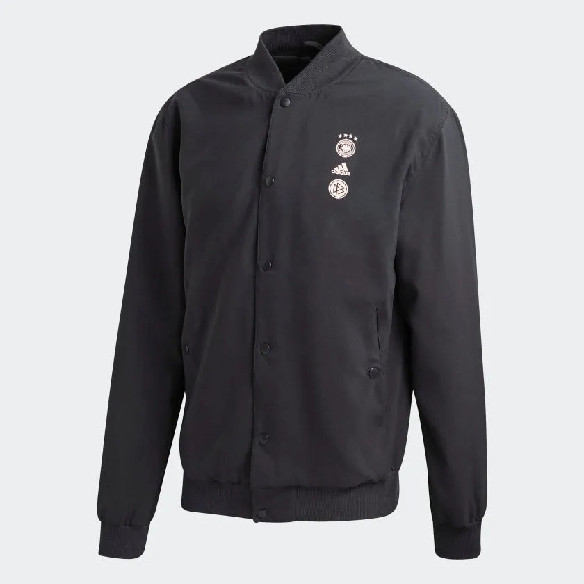Relax. Germany's players have got this. While the four-time world champions plot their return to the summit, pull on this bomber-style soccer jacket to bask in soft certainty. Picked out in seasonal colors, velvety flock-print details stand out on its silky fabric. Lining turns the luxury up to 10.